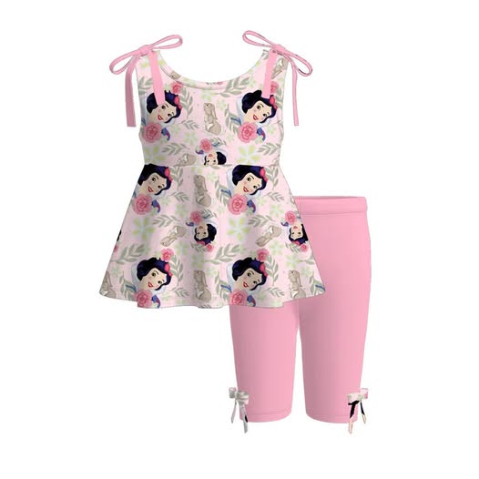 (Custom Design Preorder MOQ 5) Cartoon Princess Tunic Top Pink Shorts Girls Summer Clothes Set