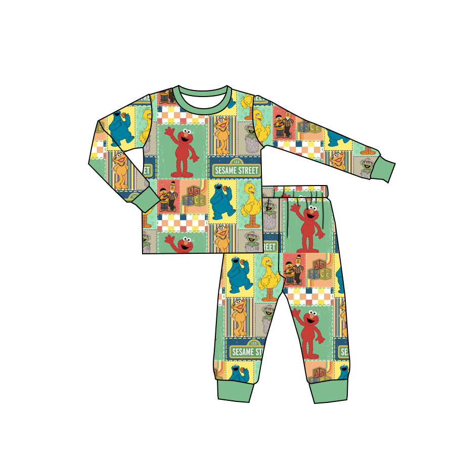 (Custom Design Preorder MOQ 20) Catoon Street Green Print Kids Fall Bamboo Pajamas Clothes Set