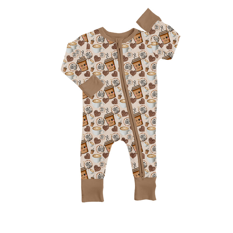 (Custom Design Preorder MOQ 20) Coffee Leopard Heart Print Baby Girls Valentine's Day Bamboo Sleeper Zipper Romper