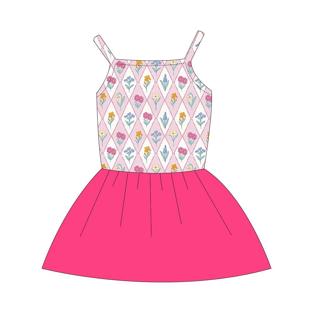 (Custom Design Preorder MOQ 5) Colorful Flowers Print Girls Summer Pink Knee Length Dress