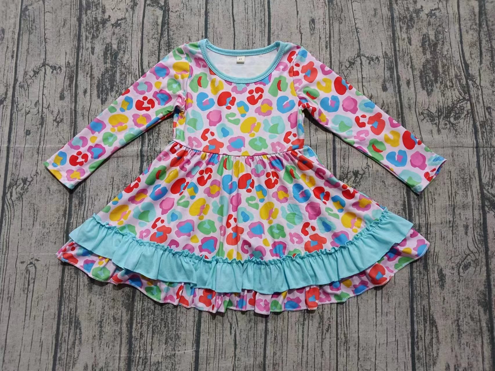 (Custom Design Preorder MOQ 5) Colorful Leopard Print Girls Long Sleeve Knee Length Dress