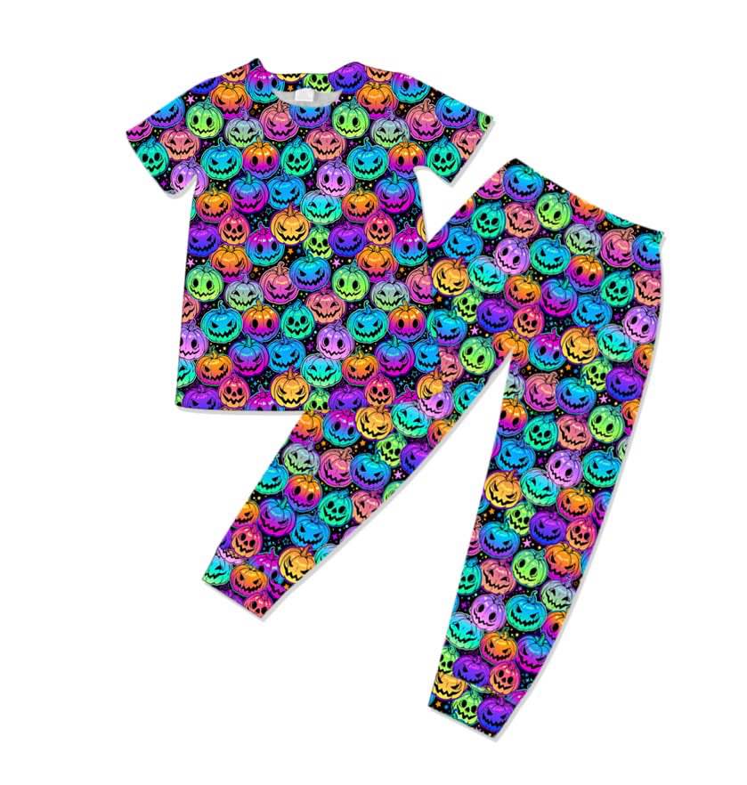 (Custom Design Preorder MOQ 20) Colorful Pumpkin Print Kids Halloween Bamboo Pajamas Clothes Set