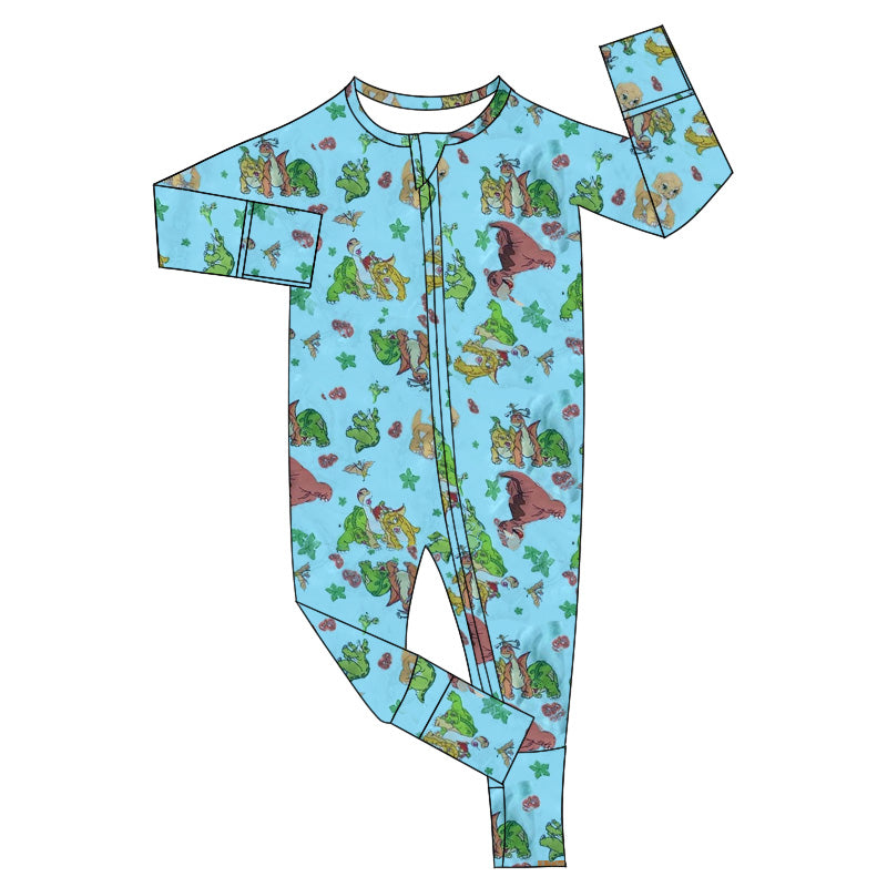 (Custom Design Preorder MOQ 20) Dino Blue Print Baby Boys Bamboo Fall Sleeper Zipper Romper