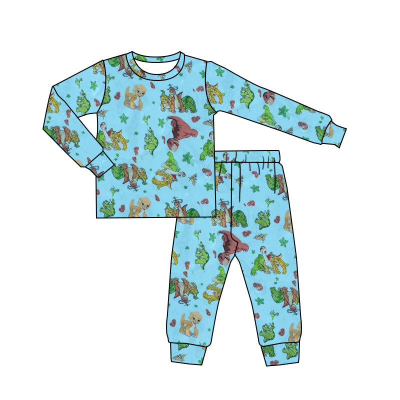 (Custom Design Preorder MOQ 20) Dino Blue Print Boys Fall Bamboo Pajamas Clothes Set