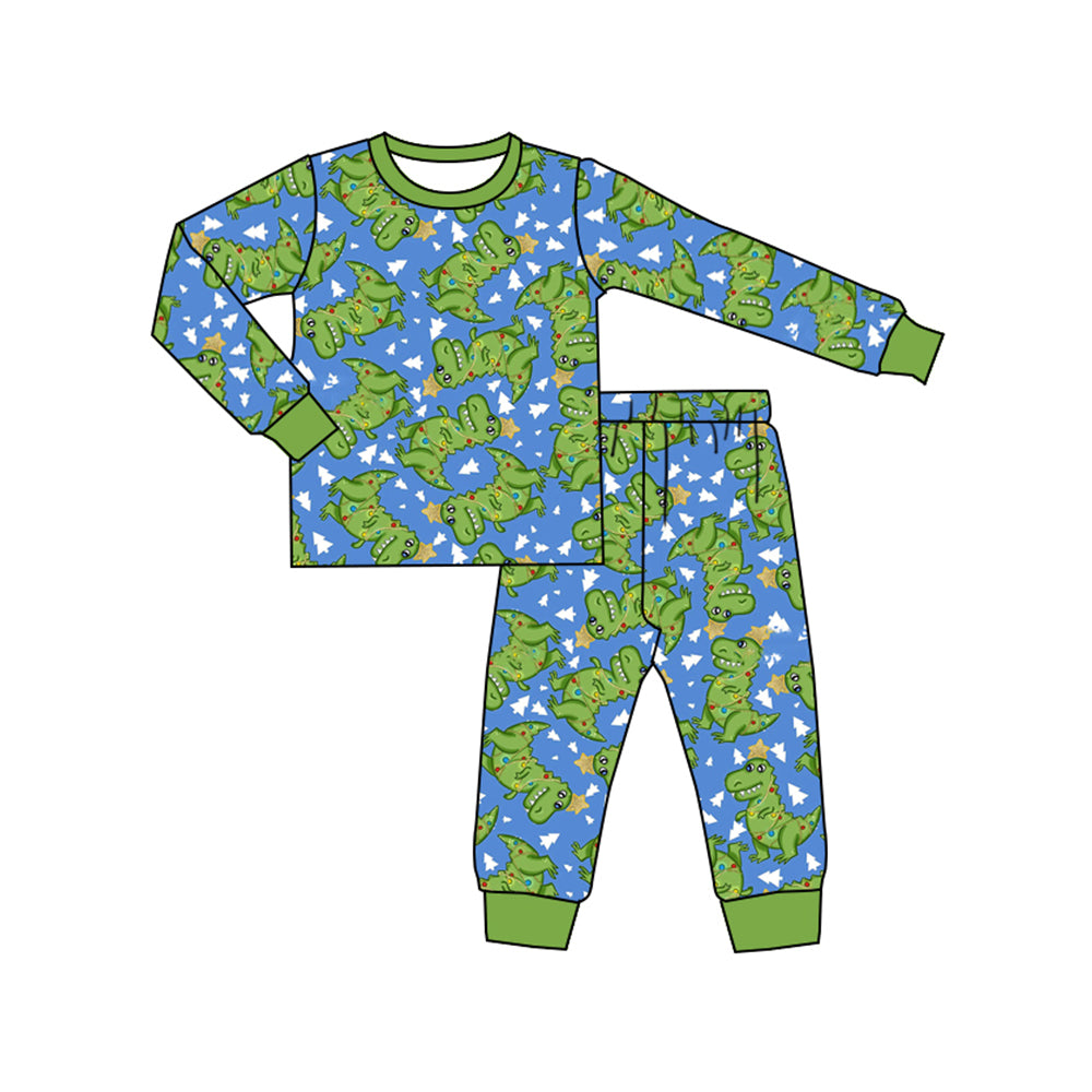 (Custom Design Preorder MOQ 20) Dino Print Boys Christmas Bamboo Pajamas Clothes Set