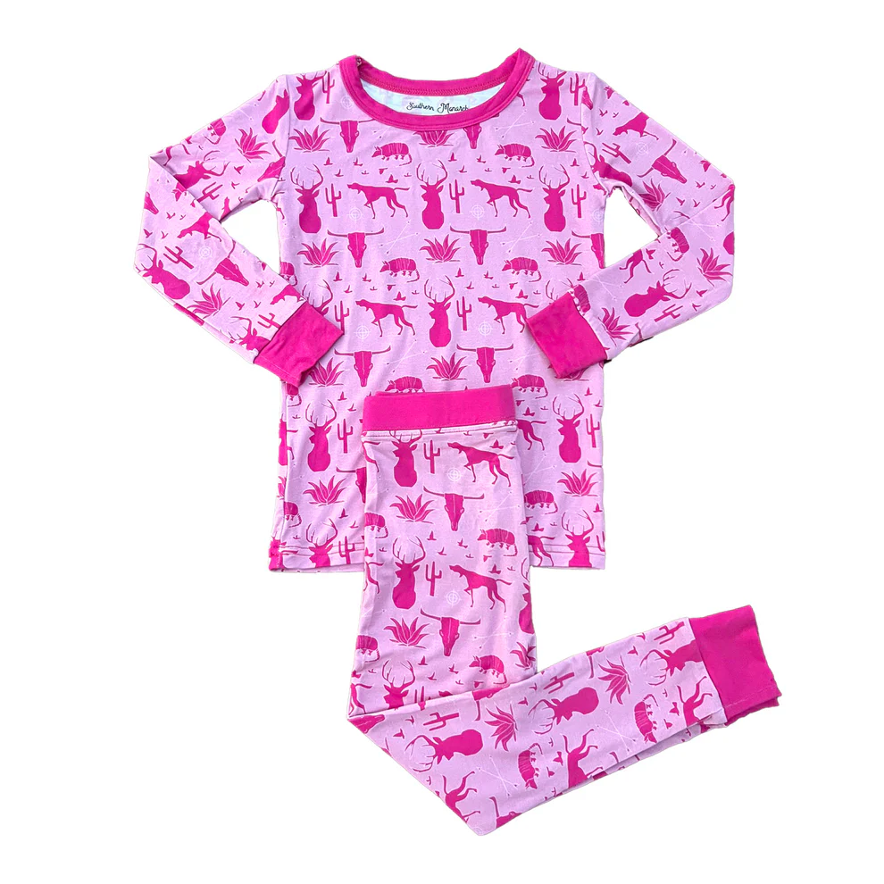 (Custom Design Preorder MOQ 20) Dog Deer Pink Print Girls Hunting Bamboo Pajamas Clothes Set