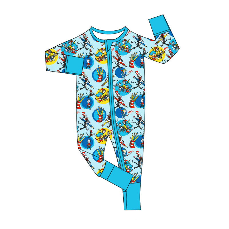 (Custom Design Preorder MOQ 20) Dr.Reading Pen Blue Print Baby Boys Bamboo Sleeper Zipper Romper