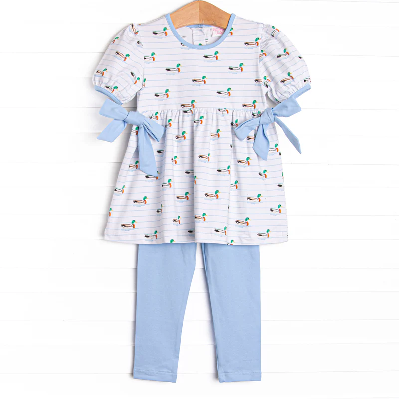 (Custom Design Preorder MOQ 5) Duck Stripes Tunic Top Blue Pants Girls Clothes Set