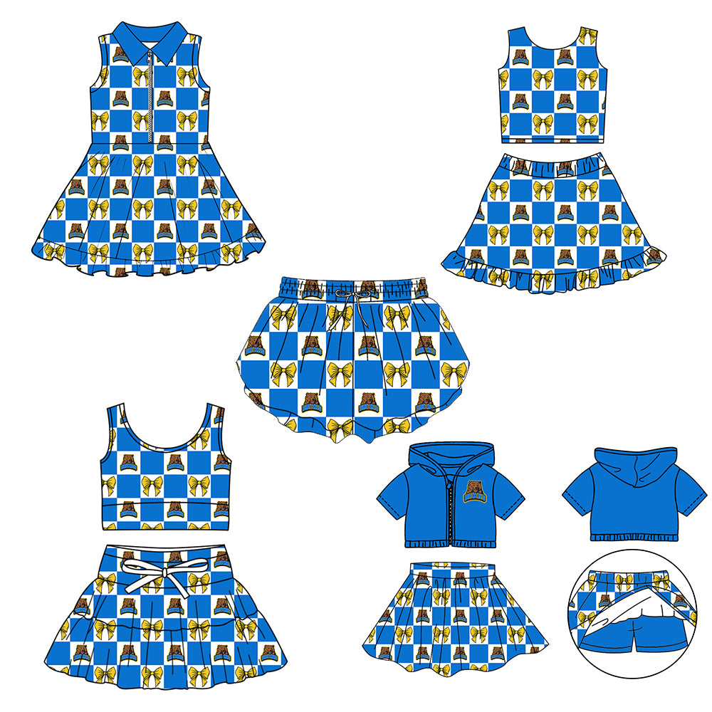 (Custom Design Preorder MOQ 5 Each Color) Team's UCLA Bruins Bows Plaid Print Girls Summer Clothes Sisters Matching Wear