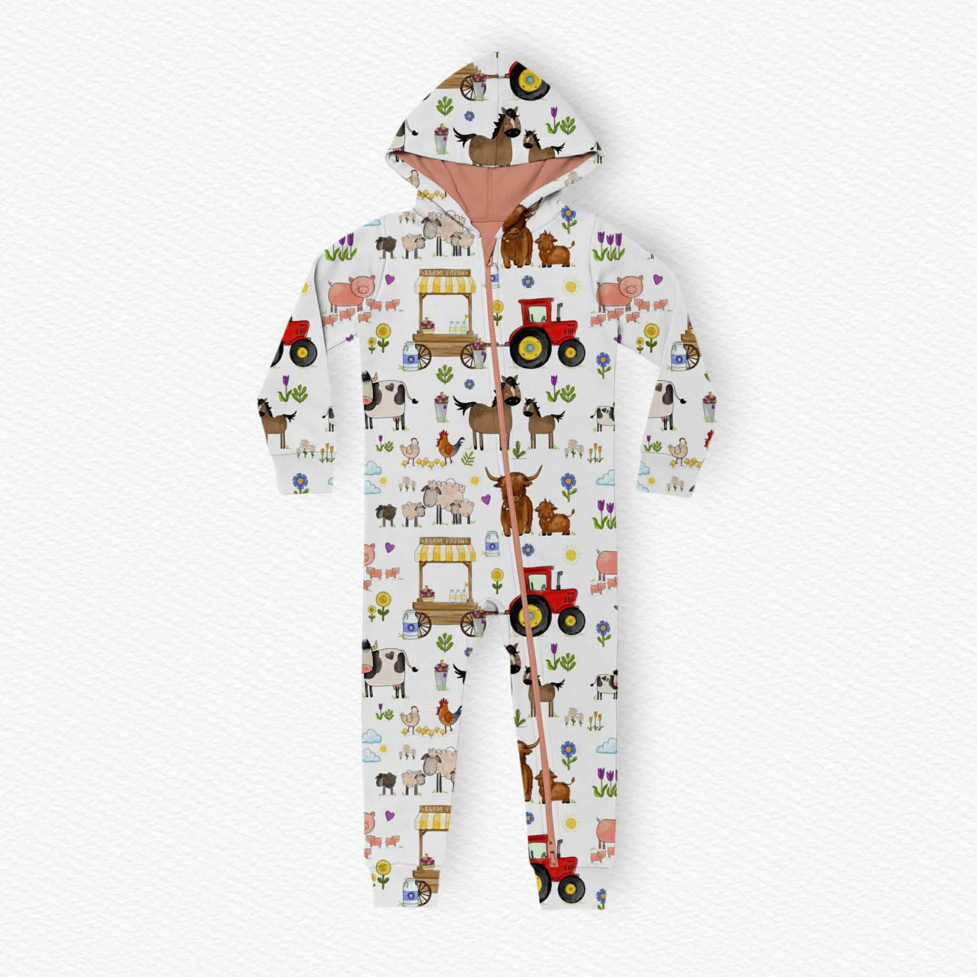 (Custom Design Preorder MOQ 5) Farm Animals Pink Print Baby Hoodie Zipper Sleeper Romper