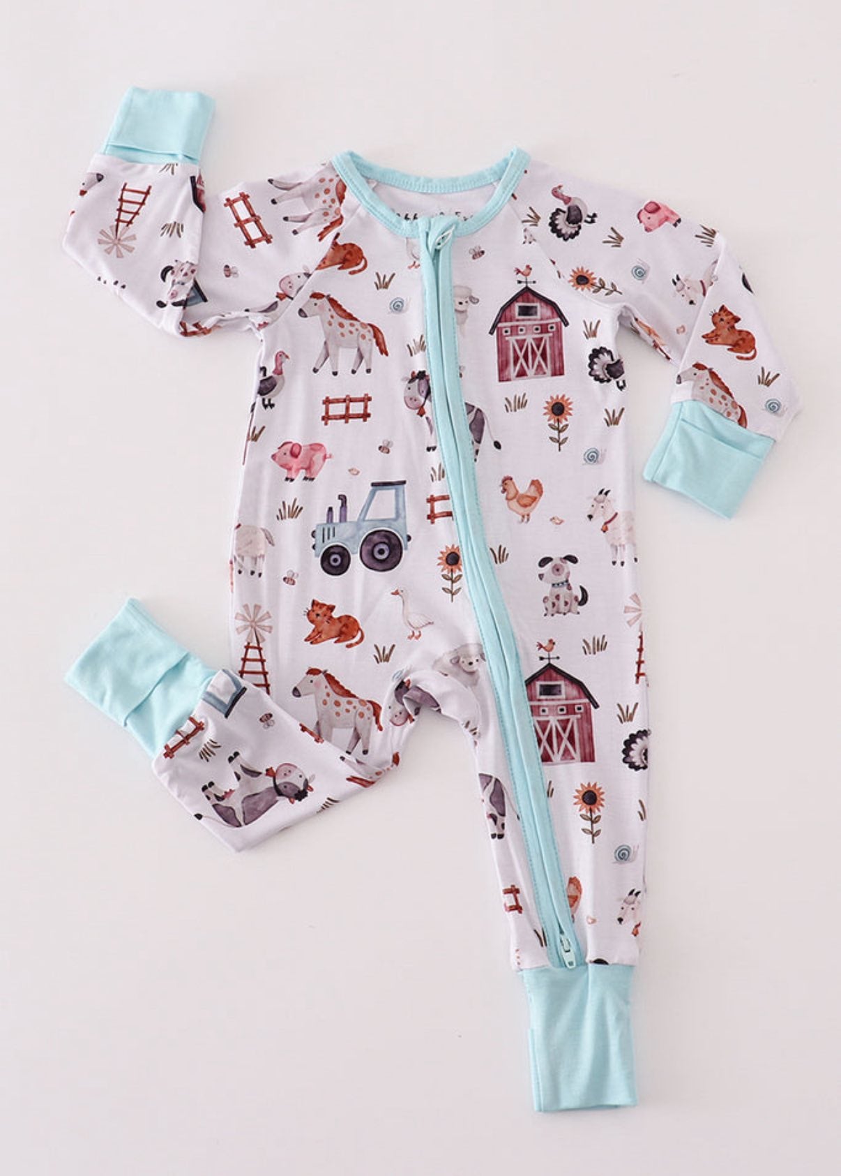 (Custom Design Preorder MOQ 5) Farm Animals Print Baby Girls Fall Sleeper Zipper Romper