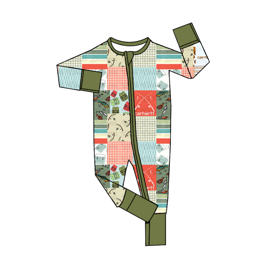 (Custom Design Preorder MOQ 20) Fishing Shopping Print Baby Boys Fall Bamboo Sleeper Zipper Romper