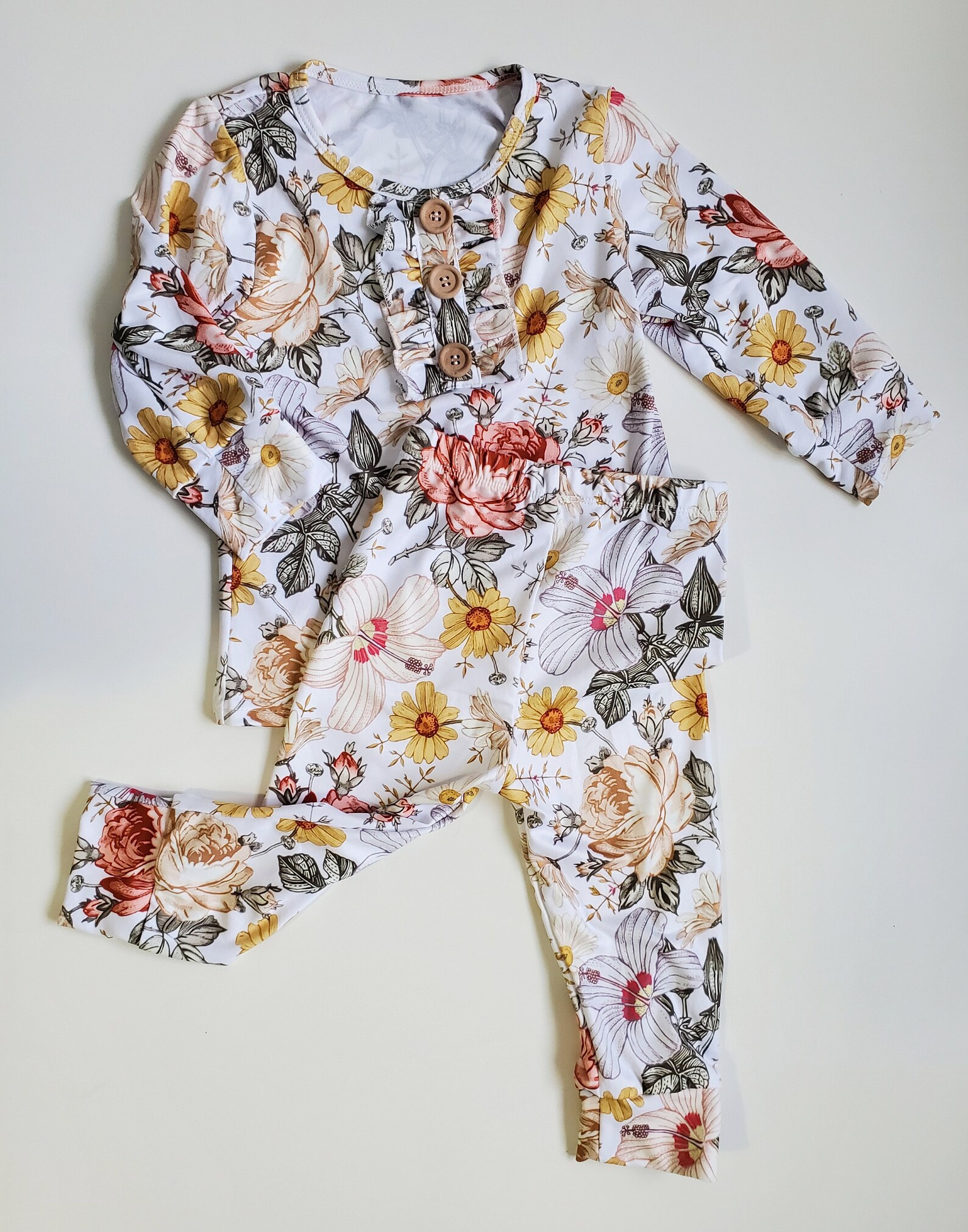 (Custom Design Preorder MOQ 5) Flowers Print Girls Ruffles Pajamas Clothes Set