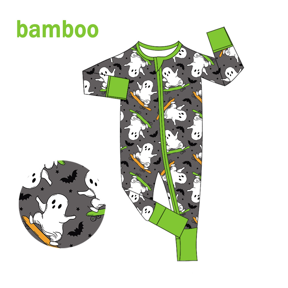(Custom Design Preorder MOQ 20) Ghost Bat Print Baby Boys Halloween Long Sleeve Bamboo Sleeper Zipper Romper