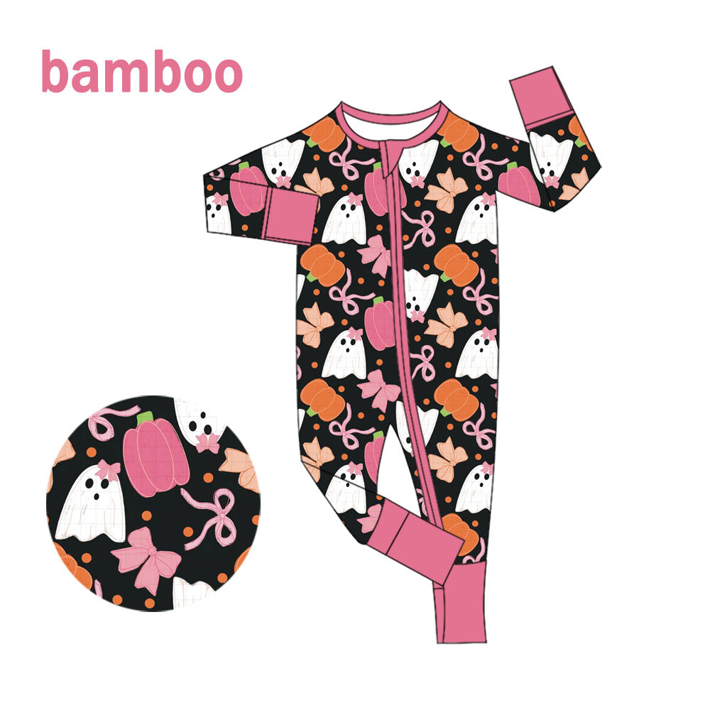 (Custom Design Preorder MOQ 20) Ghost Bows Print Baby Girls Halloween Long Sleeve Bamboo Sleeper Zipper Romper