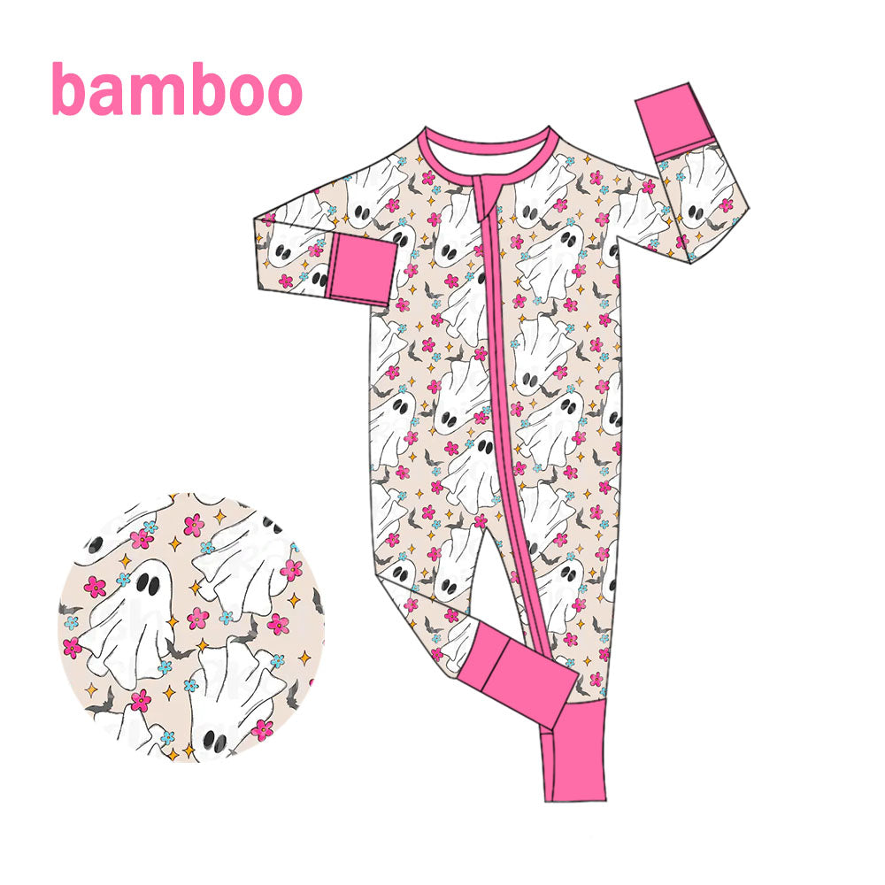 (Custom Design Preorder MOQ 20) Ghost Flowers Print Baby Girls Halloween Long Sleeve Bamboo Sleeper Zipper Romper