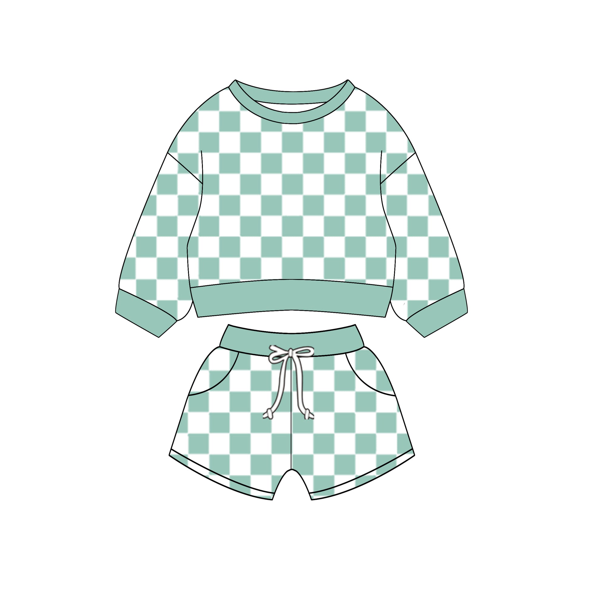 (Custom Design Preorder MOQ 5) Green Plaid Long Sleeve Top Pockets Shorts Girls Clothes Set