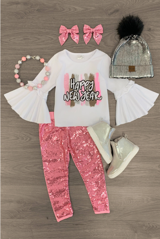 (Custom Design Preorder MOQ 5) Happy New Year Sequin Pants Girls Clothes Set