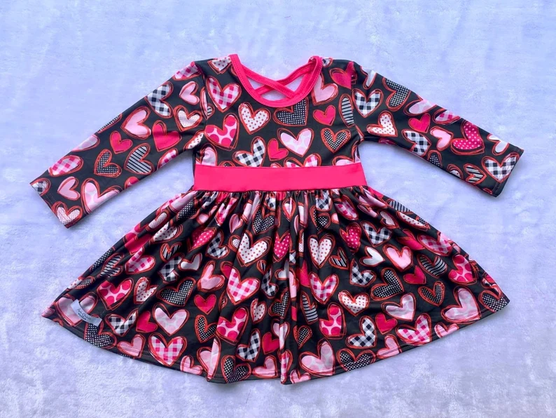 (Custom Design Preorder MOQ 5) Heart Print Girls Knee Length Valentine's Dress