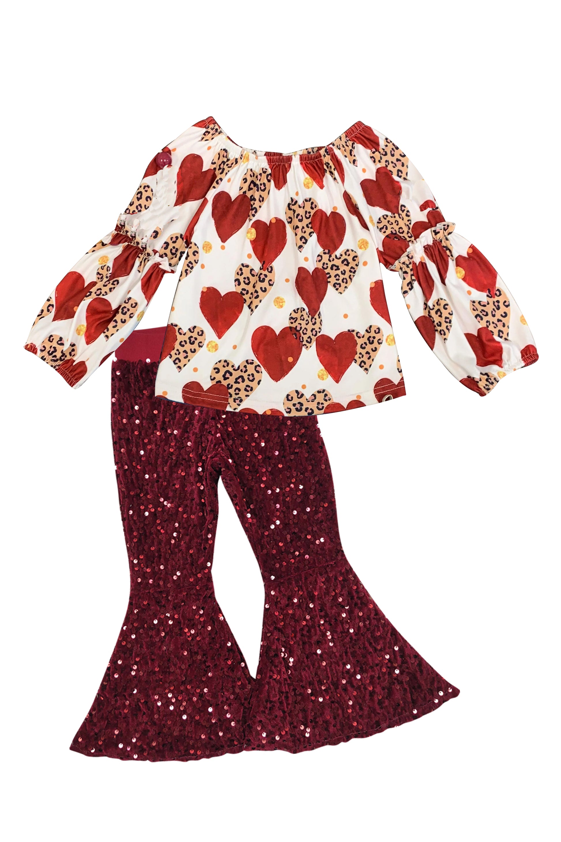 (Custom Design Preorder MOQ 5) Heart Top Wine Sequin Pants Girls Valentine's Clothes Set