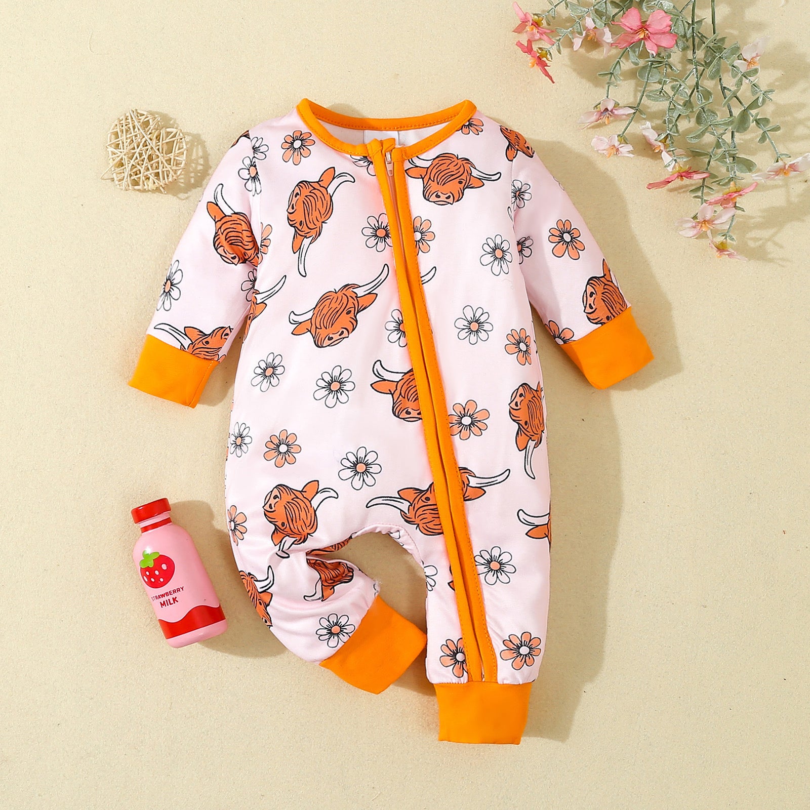 (Custom Design Preorder MOQ 20) Highland Cow Print Baby Girls Bamboo Sleeper Zipper Romper