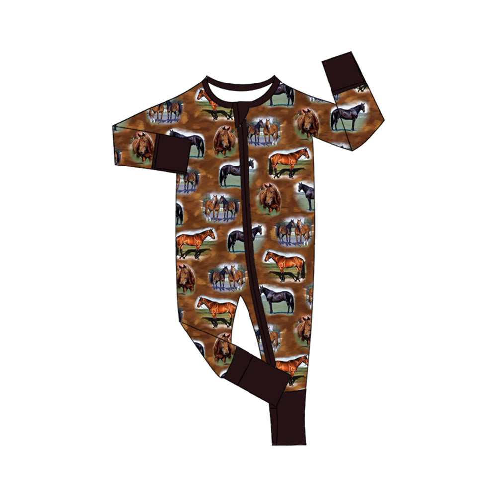 (Custom Design Preorder MOQ 20) Horse Brown Print Baby Boys Bamboo Fall Sleeper Zipper Romper