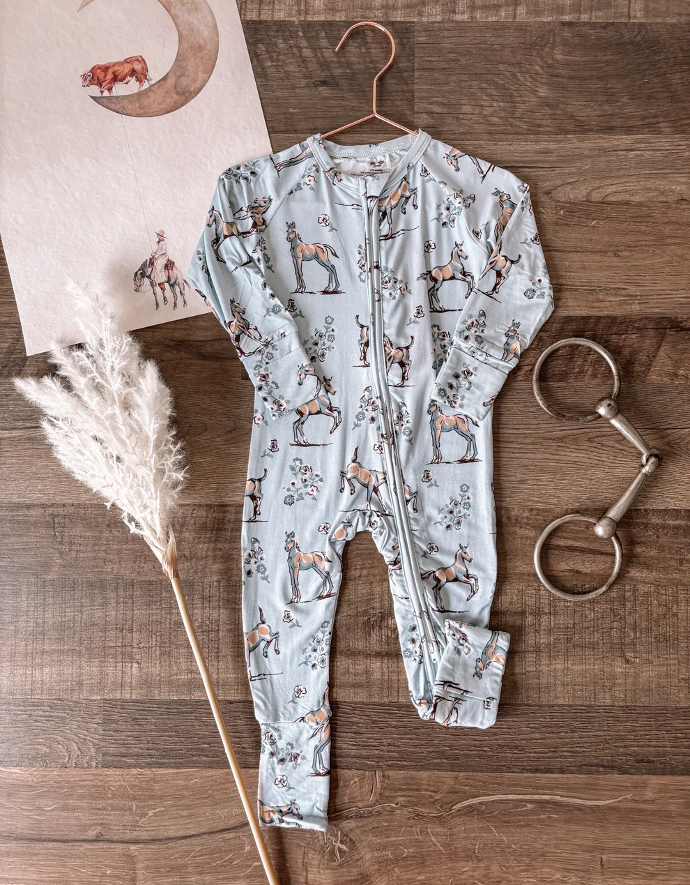 (Custom Design Preorder MOQ 20) Horse Flowers Grey Print Baby Girls Bamboo Sleeper Zipper Romper