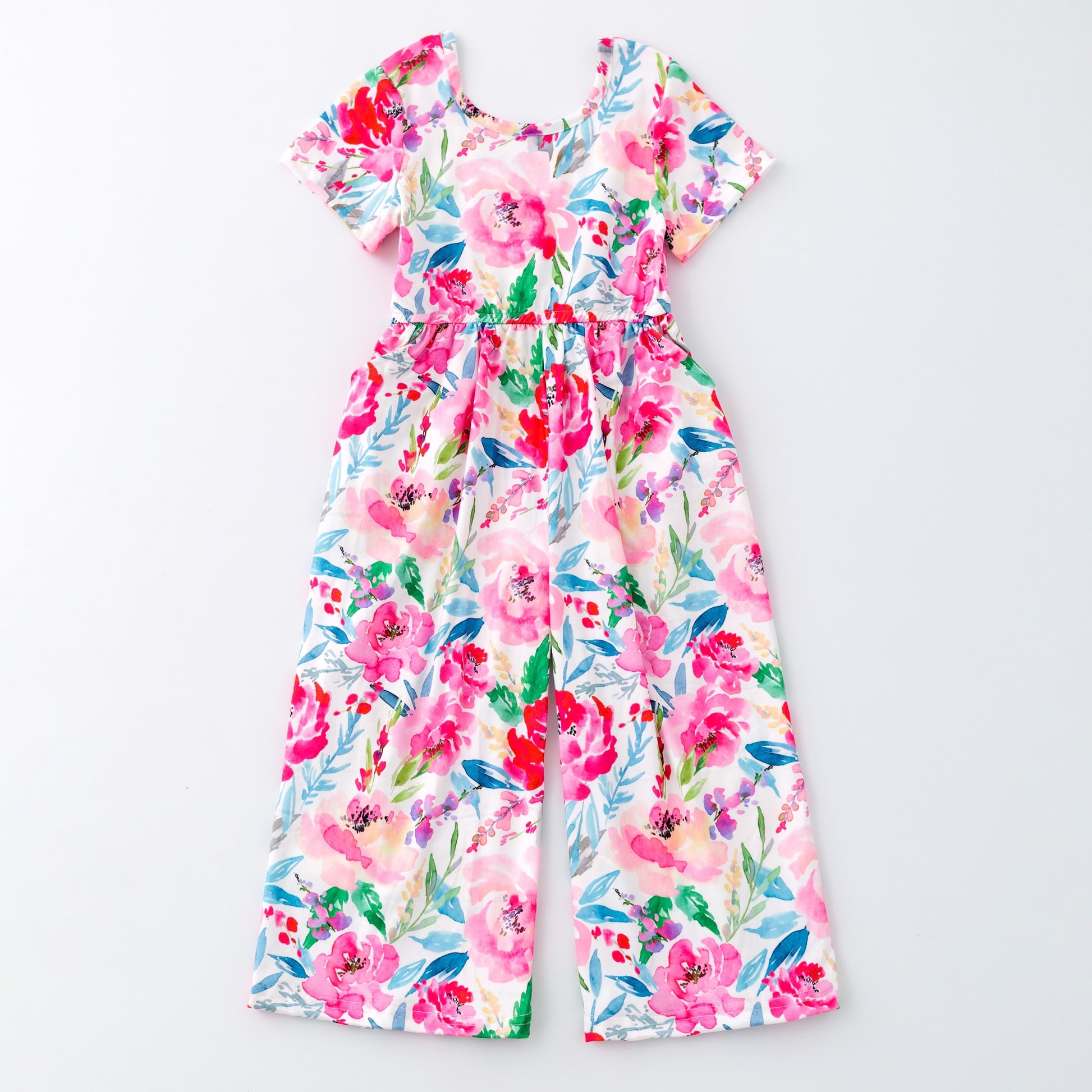 (Custom Design Preorder MOQ 5) Hot Pink Flowers Print Pockets Girls Summer Jumpsuits