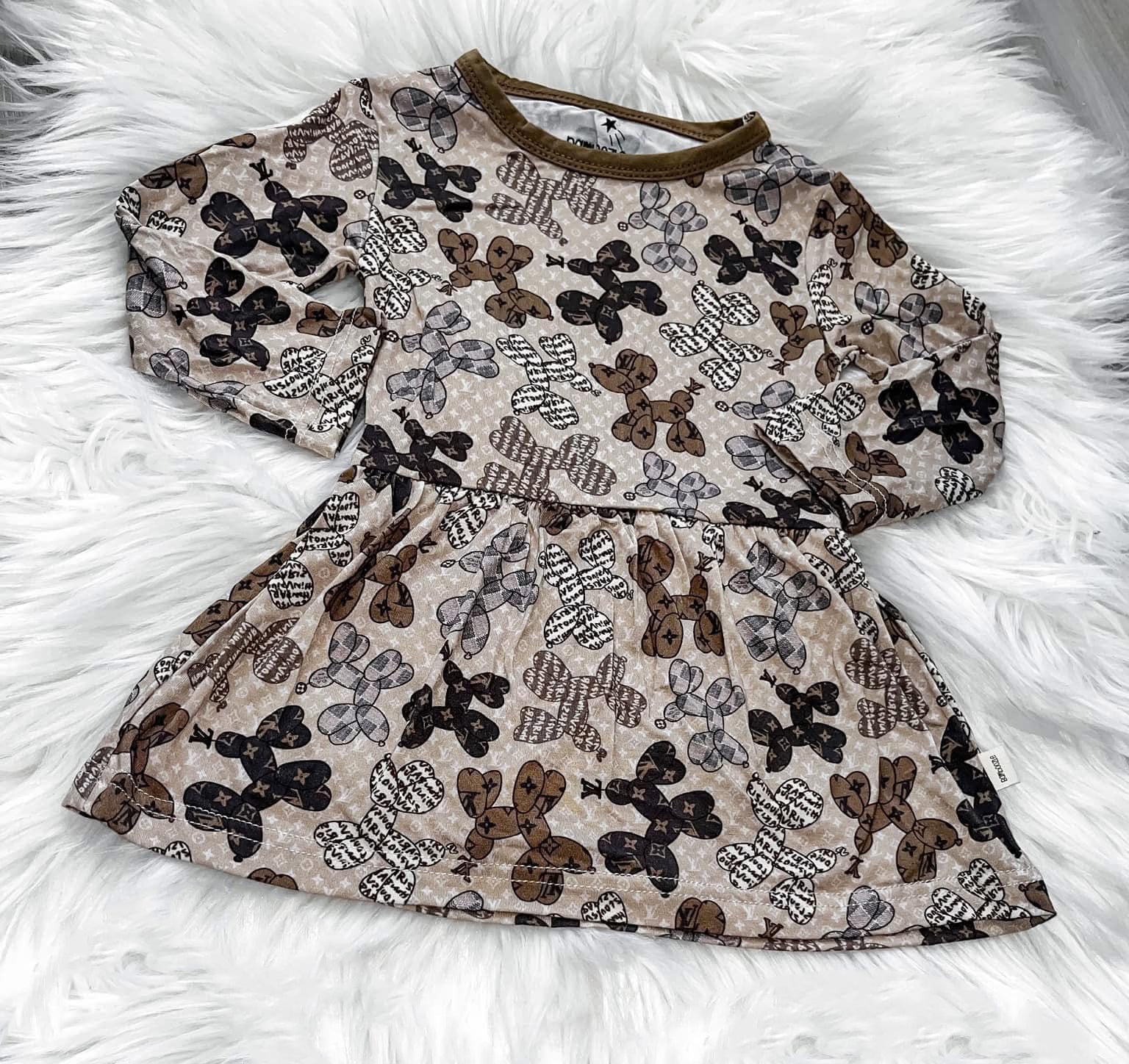 (Custom Design Preorder MOQ 5) L**V Dog Brown Print Girls Knee Length Dress