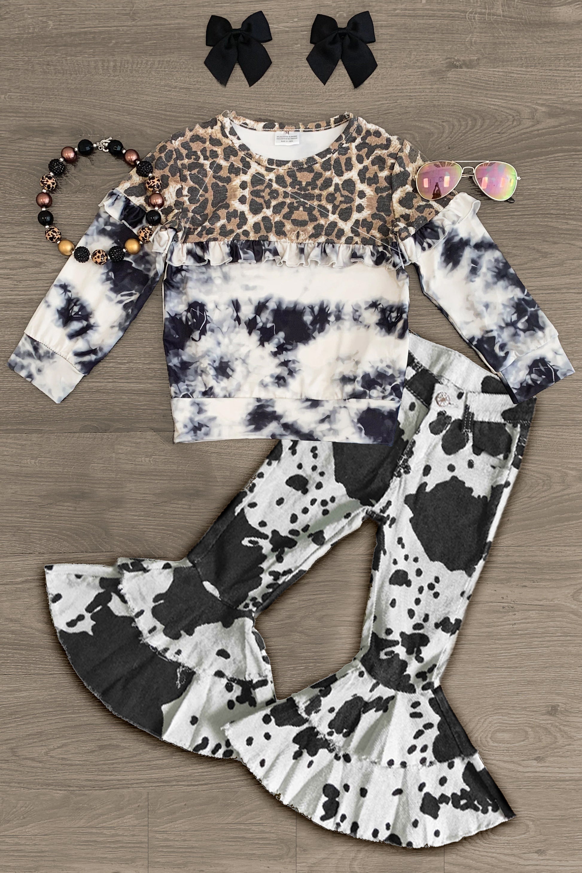 (Custom Design Preorder MOQ 5) Leopard Black Tie-dye Top Cow Print Denim Jeans Girls Clothes Set
