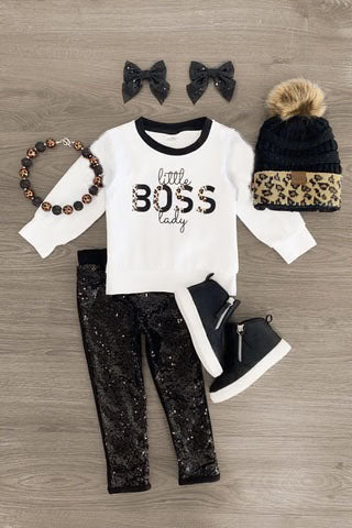 (Custom Design Preorder MOQ 5) Little Boss Lady Top Sequins Legging Pants Girls Clothes Sets