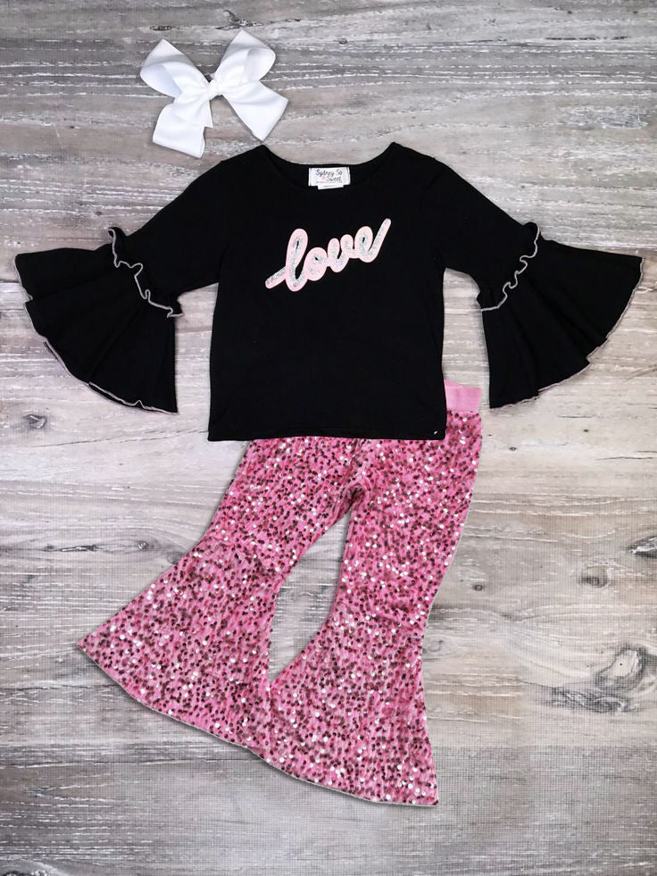 (Custom Design Preorder MOQ 5) Love Black Top Pink Sequin Bell Pants Girls Valentine's Clothes Set