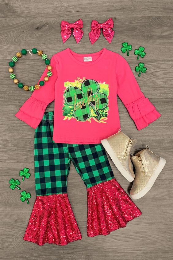 (Custom Design Preorder MOQ 5) Lucky Green Quatrefoil Top Sequin Ruffle Pants Girls St. Patrick's Clothes Set
