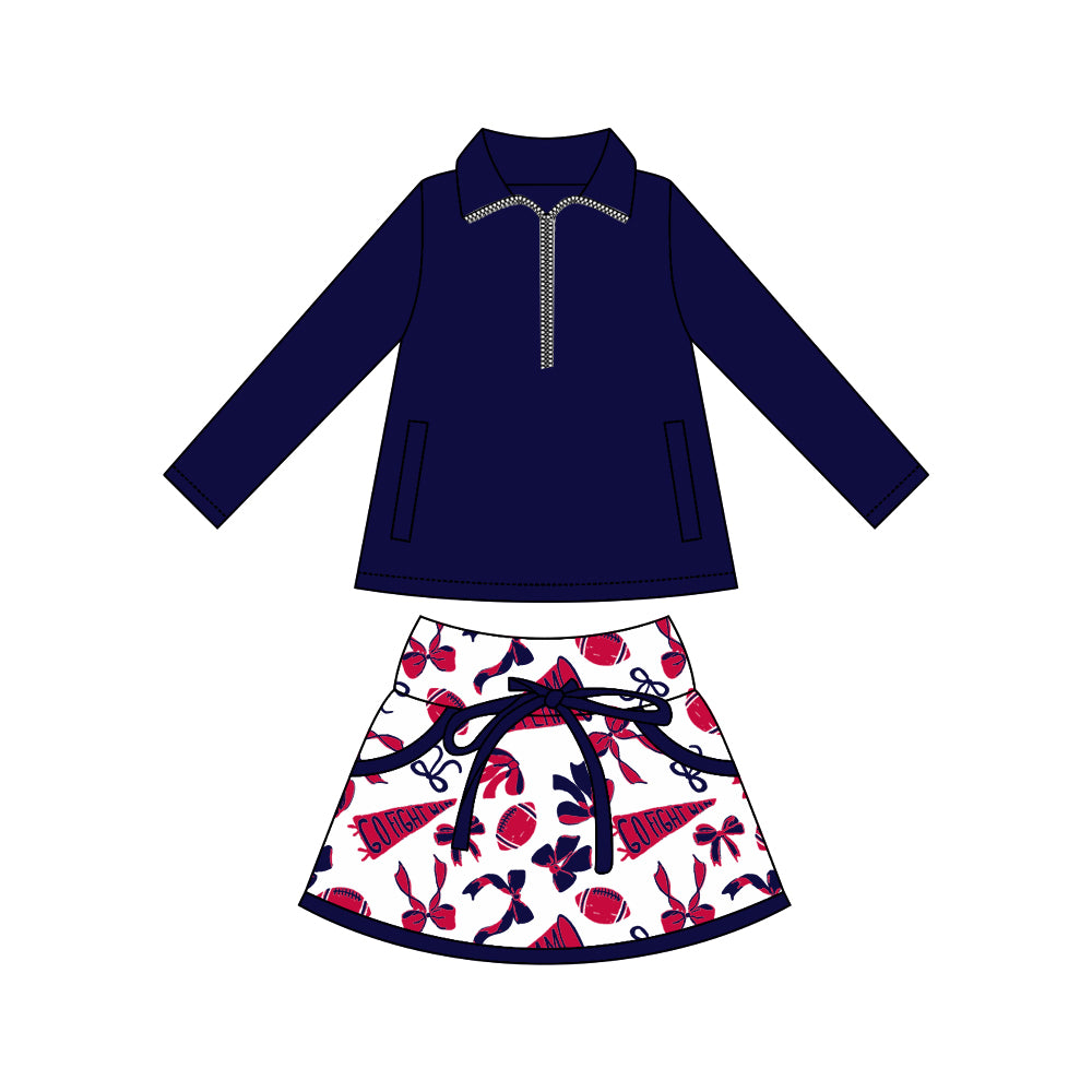 (Custom Design Preorder MOQ 5) Navy Zipper Pullover Top Team's Cheer Bows Skirts Girls Clothes Sets