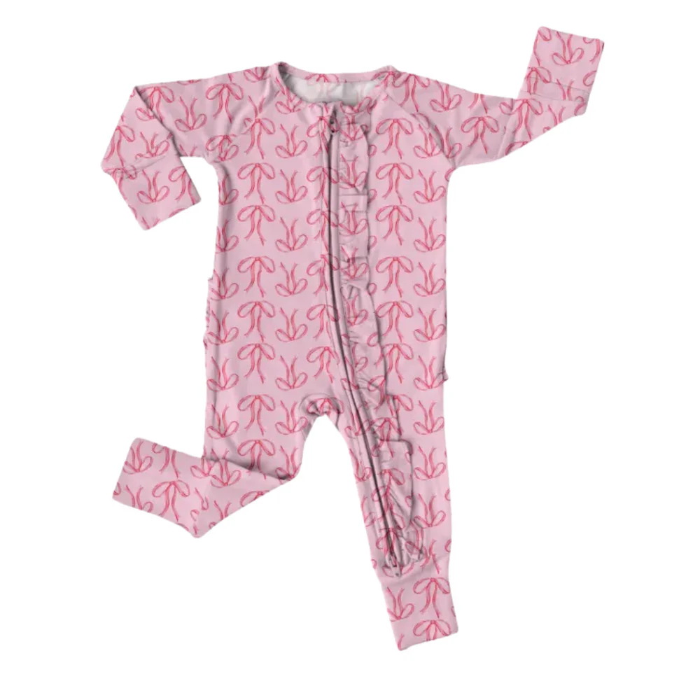 (Custom Design Preorder MOQ 20) Pink Bows Print Baby Girls Bamboo Sleeper Zipper Romper