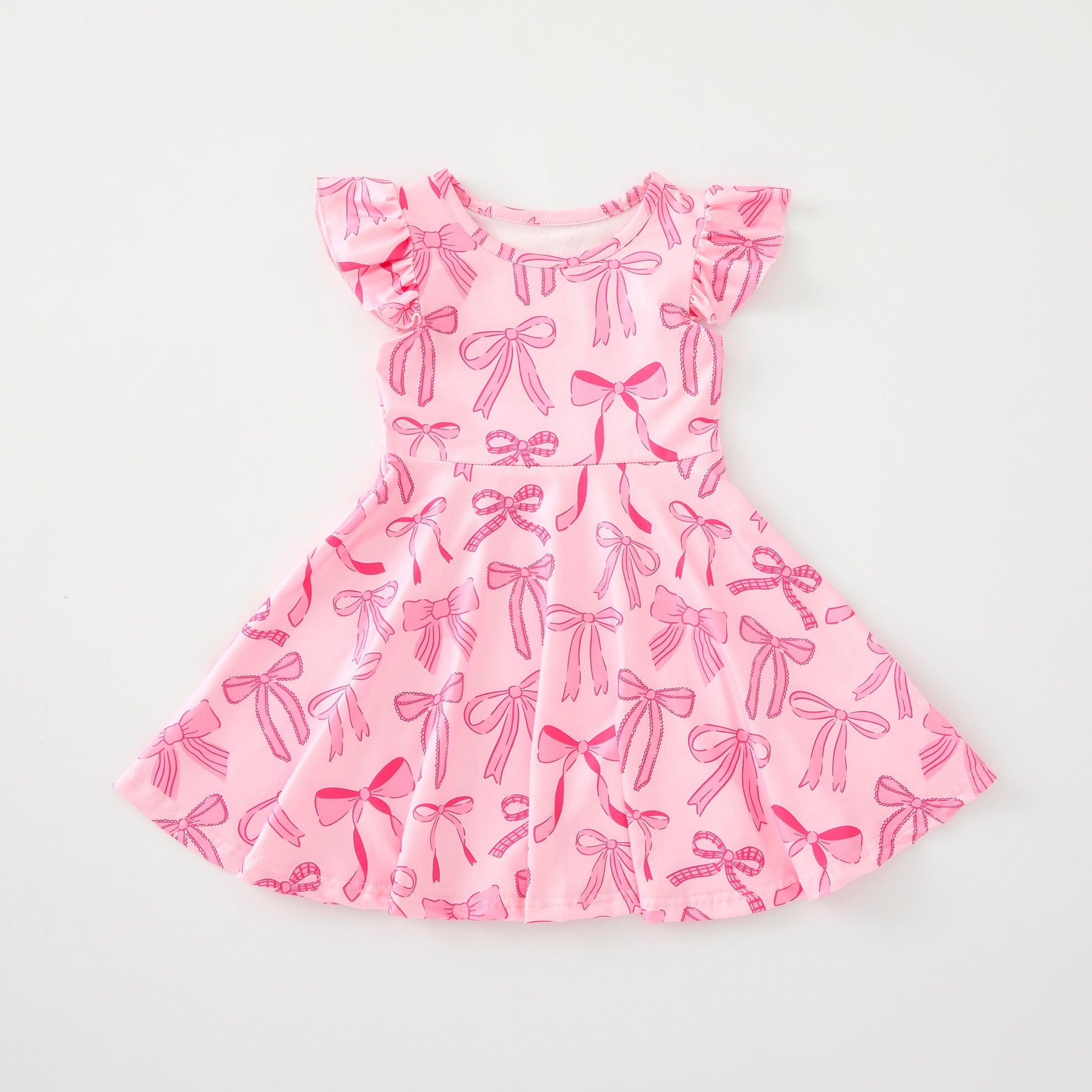 (Custom Design Preorder MOQ 5 ) Pink Bows Print Girls Summer Knee Length Dress