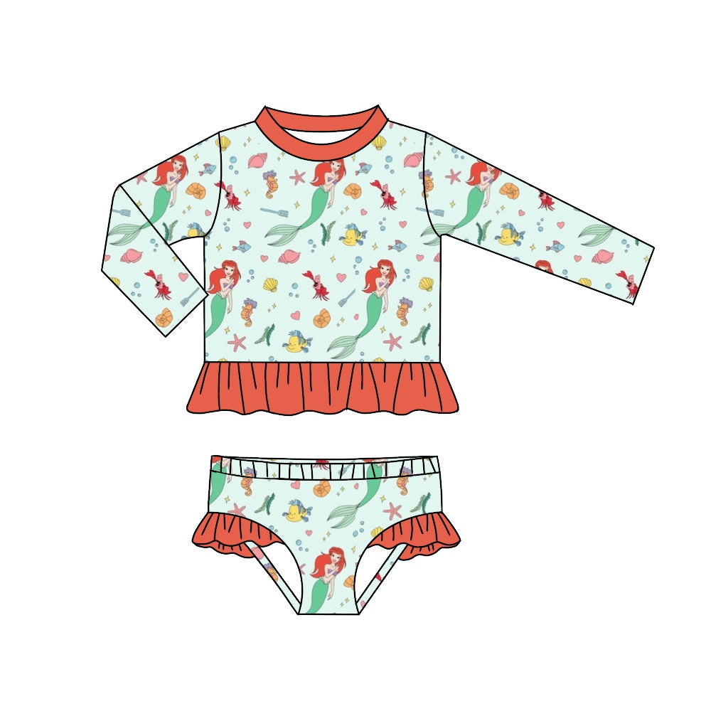 (Custom Design Preorder MOQ 5) Princess Mermaid Print Girls 2 Pieces Long Sleeve Swimsuits
