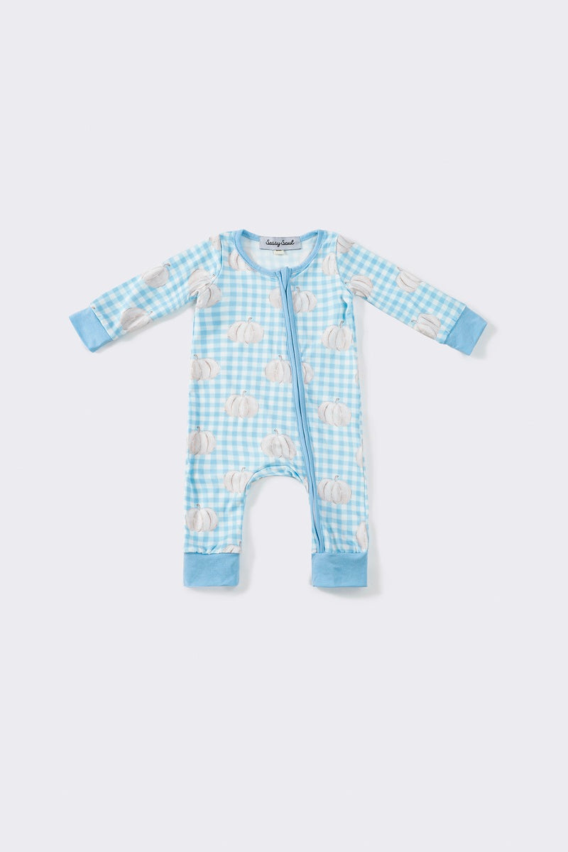 (Custom Design Preorder MOQ 20) Pumpkin Blue Plaid Print Baby Boys Fall Bamboo Sleeper Zipper Romper
