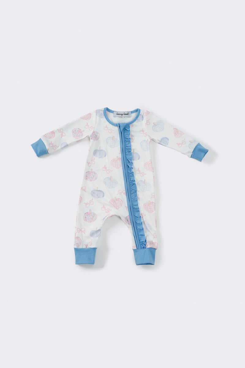 (Custom Design Preorder MOQ 20) Pumpkin Bows Blue Print Baby Girls Fall Bamboo Sleeper Zipper Romper