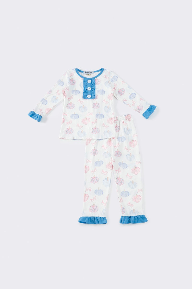 (Custom Design Preorder MOQ 20) Pumpkin Bows Blue Print Girls Fall Bamboo Pajamas Clothes Set
