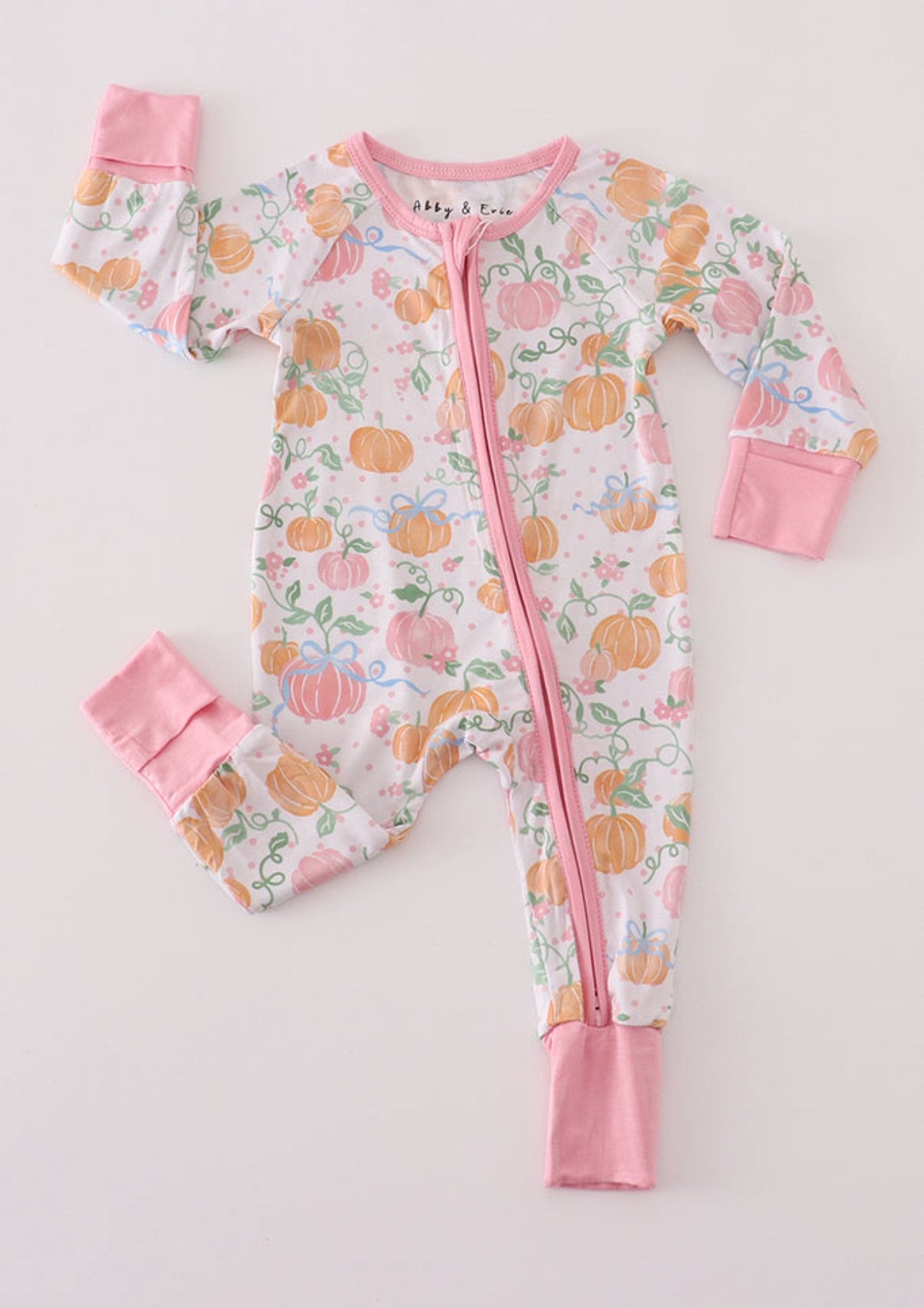 (Custom Design Preorder MOQ 5) Pumpkin Bows Print Baby Girls Fall Sleeper Zipper Romper