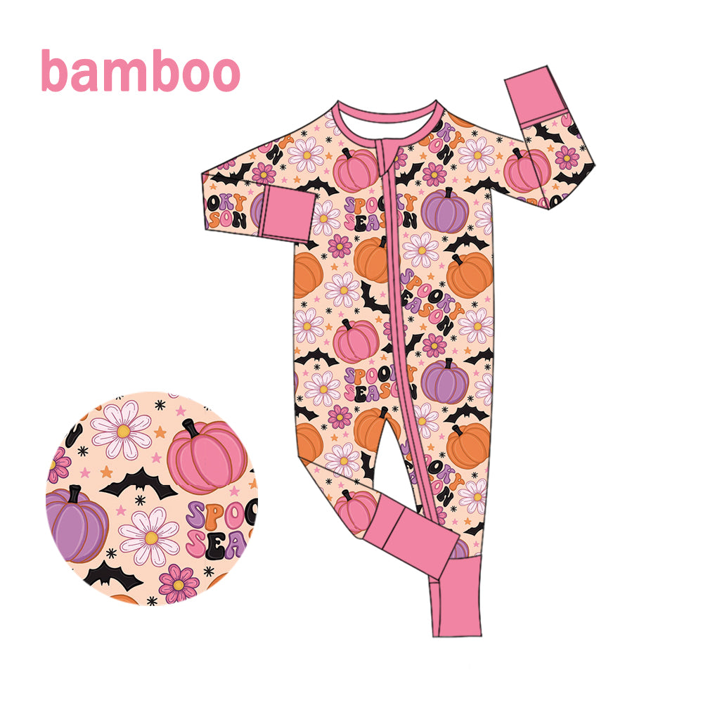(Custom Design Preorder MOQ 20) Pumpkin Flowers Bat Print Baby Girls Halloween Long Sleeve Bamboo Sleeper Zipper Romper