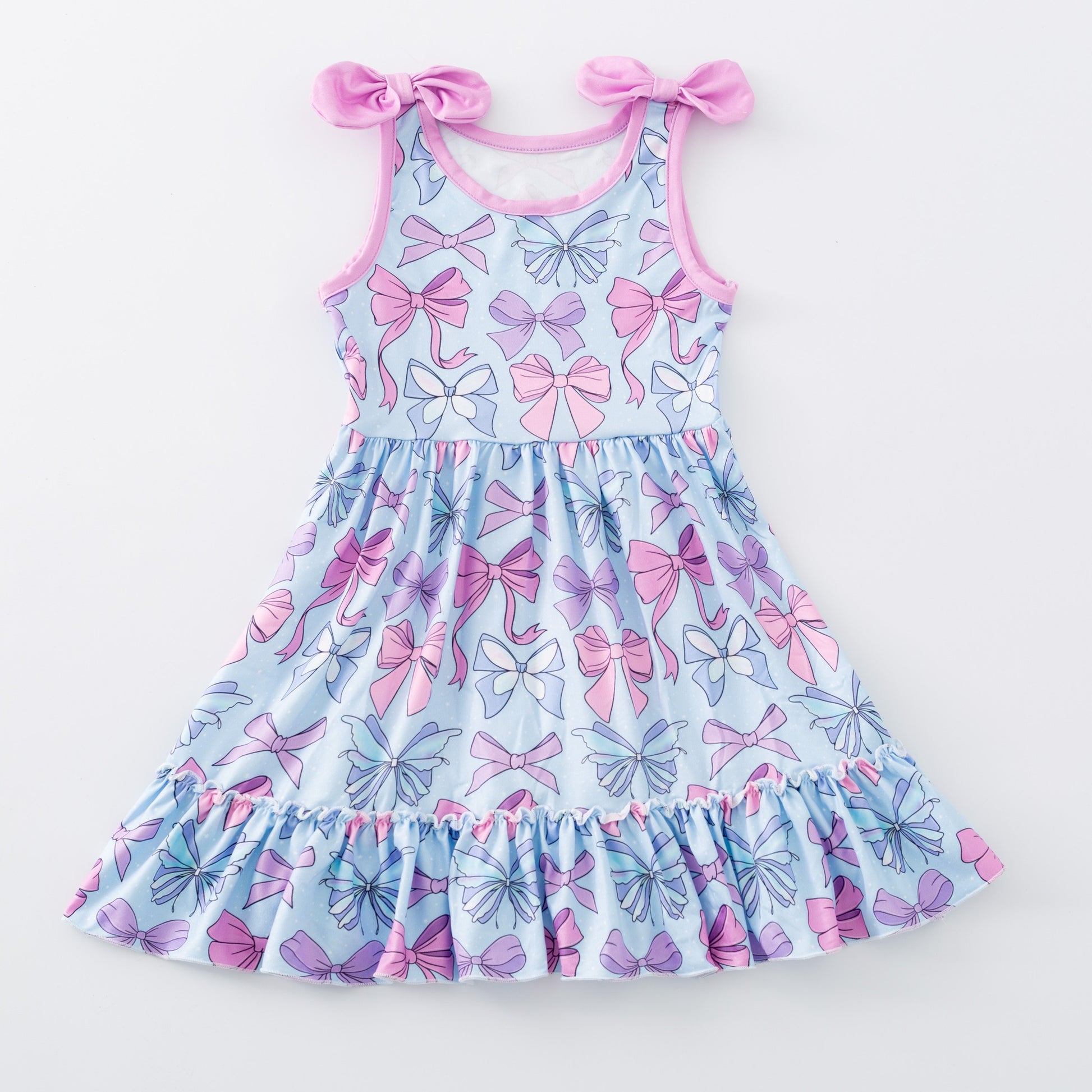 (Custom Design Preorder MOQ 5 ) Purple Blue Bows Print Girls Summer Knee Length Dress