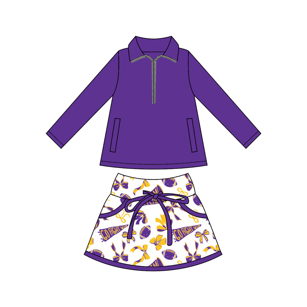 (Custom Design Preorder MOQ 5) Purple Zipper Pullover Top Team's Cheer Bows Skirts Girls Clothes Sets