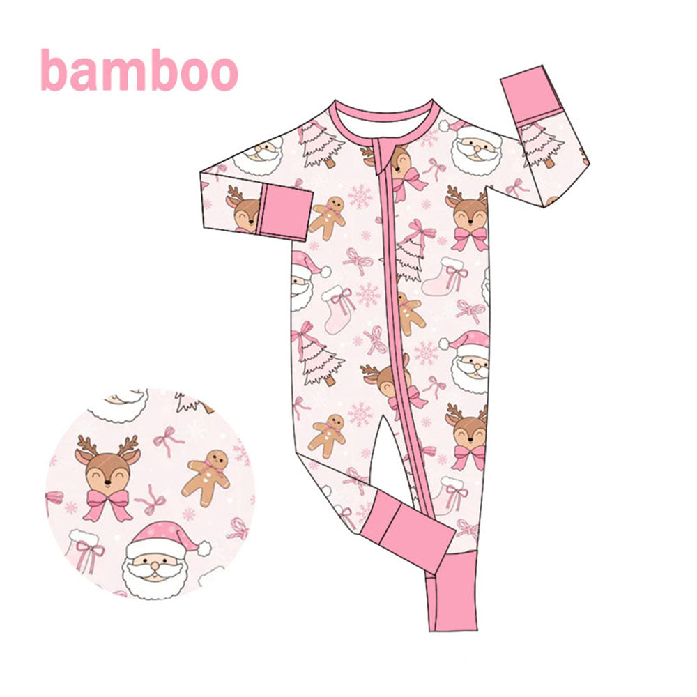 (Custom Design Preorder MOQ 20) Santa Gingerbread Bows Print Baby Girls Christmas Long Sleeve Bamboo Sleeper Zipper Romper