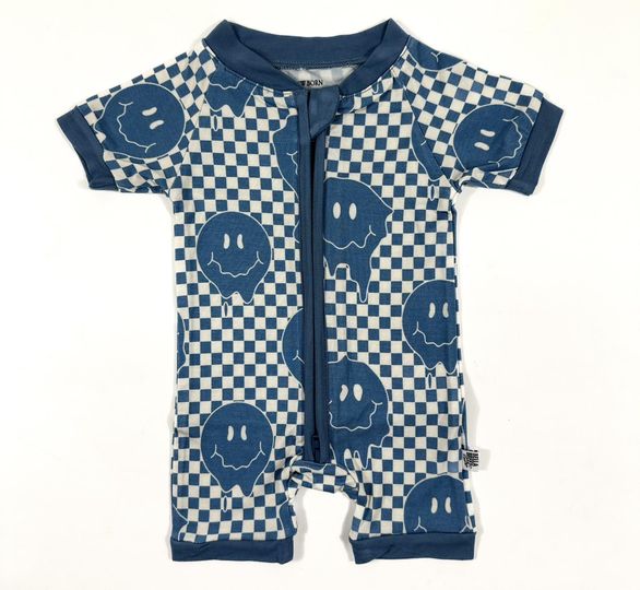 (Custom Design Preorder MOQ 20) Smiling Face Blue Plaid Print Baby Boys Summer Bamboo Sleeper Zipper Romper
