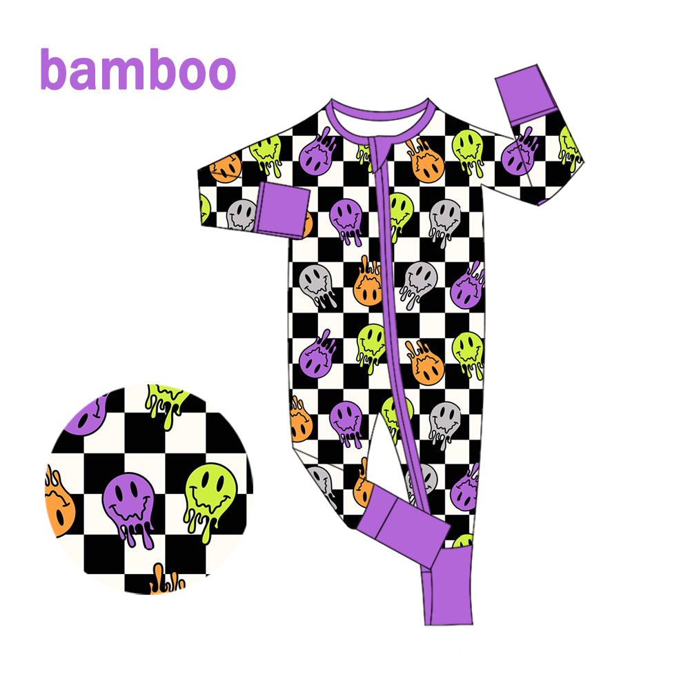 (Custom Design Preorder MOQ 20) Smiling Face Plaid Print Baby Halloween Long Sleeve Bamboo Sleeper Zipper Romper