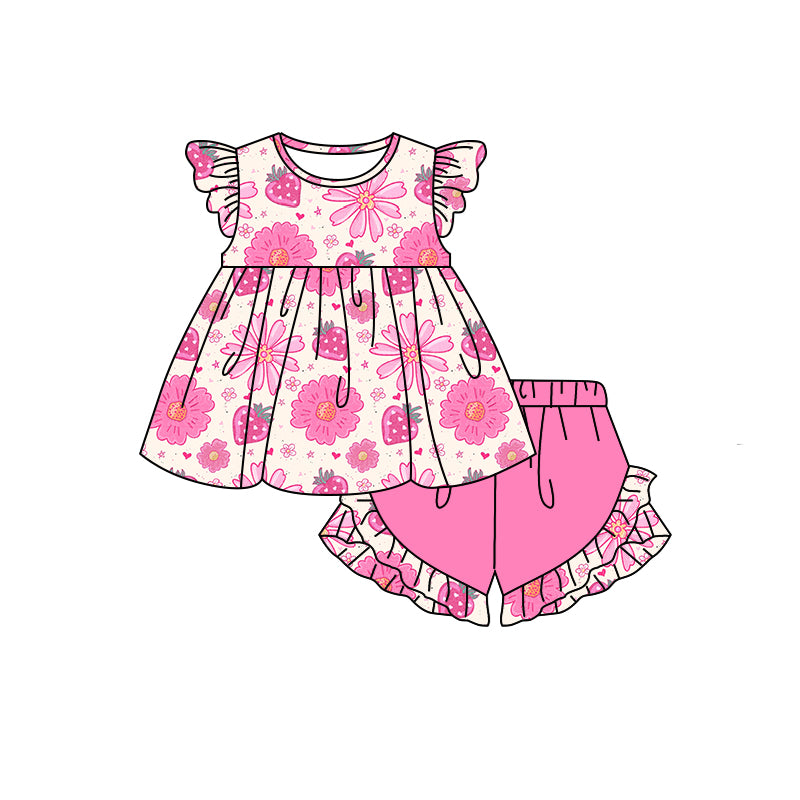 (Custom Design Preorder MOQ 5) Strawberry Flowers Top Bell Pants Girls Clothes Set