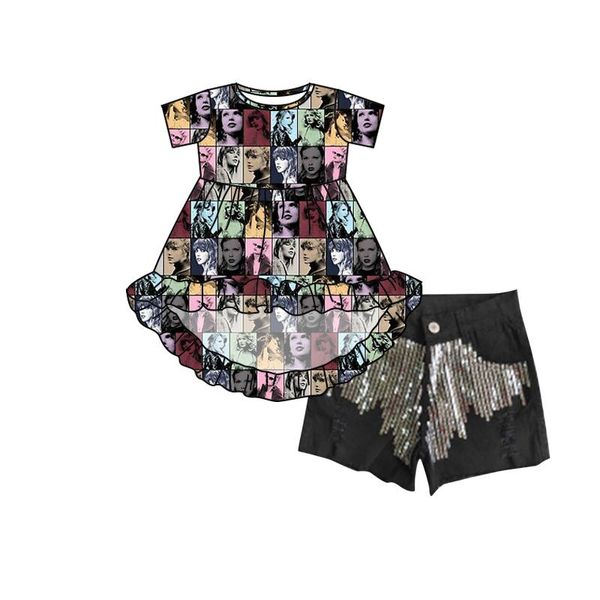 (Custom Design Preorder MOQ 5)D8-4 Swiftie High-Low Top Black Sequins Denim Shorts Girls Summer Clothes Set
