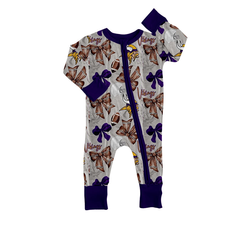 (Custom Design Preorder MOQ 20) Team's Vikings Bows Print Baby Girls Fall Bamboo Sleeper Zipper Romper